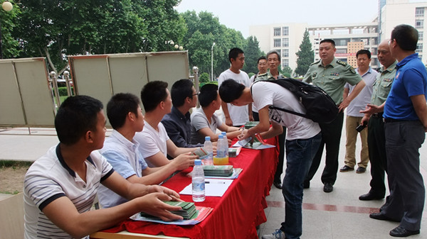 5月22日上午,学校在北校区1号教学楼广场举行2015年征兵宣传活动。淮南市田家庵区人民武装部部长胡南海、政委方结明等一行人员参加了本次活动并与学生进行交流。