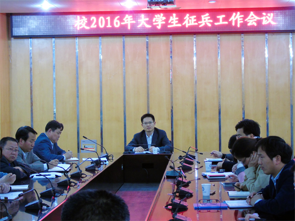 会上,周峰指出征集大学生参军入伍是党中央、国务院、中央军委做出的一项重大战略性决策,是一项利教、利人、利国、利军、利民的重要举措;要求各单位深刻领会2016年全国大学生征兵工作网络视频会议精神,认真学习国家、省及学校征兵相关政策文件,提高认识,明确职责,勇担使命;强调校人武部要认真做好征兵协调服务工作,各学院要按照任务分解,努力做好本职工作,保障我校2016年征兵工作顺利进行。