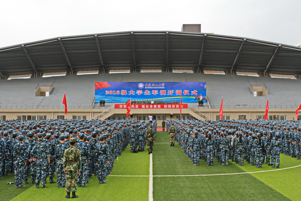 开训仪式在庄严激昂的国歌中拉开了帷幕。吴照明作了军训动员讲话。他指出,军训既是教学大纲的要求,也是同学们掌握基本军事技能和军事理论的有效形式,是弘扬爱国主义、集体主义和革命英雄主义精神,增强国防观念、国家安全意识的重要途径。他希望同学们提高认识,居安思危,牢固树立保家卫国的国防意识;严明纪律,听从指挥,牢固树立令行禁止的纪律意识;端正态度,自立自强,牢固树立互帮互助的团队意识。吴照明最后要求同学们秉承“团结、奋进、博学、奉献”的校训,弘扬“志存高远、追求卓越、求真务实”校园精神,练就铁骨铮铮、硬气朗朗,以良好的精神面貌和坚韧的意志品质续写大学生活的别样精彩。